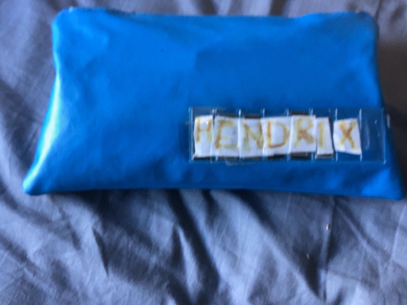 It looks like you have a vibrant blue pencil case there! It appears to be made of a flexible material, possibly a soft plastic or fabric, and it has a clear label holder on the front with the name "HENDRIX" spelled out in individual letter tiles. It's a fun and personalized way to keep your pencils and pens organized.